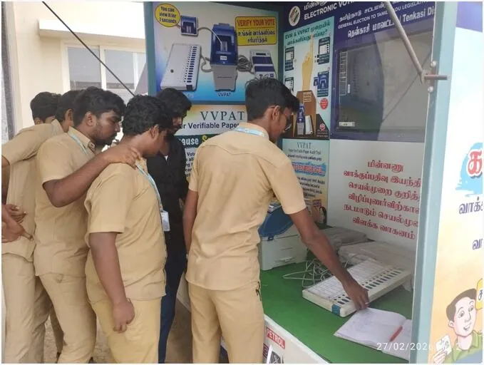 An awareness programme on the use of Electronic Voting Machine and Voter Verifiable Paper Audit Trail was conducted on February 27, 2026 through a demonstration vehicle from the Collector Office Tenkasi. The programme aimed to promote electoral literacy and encourage responsible voting among students. Participants were given hands-on experience in casting a mock vote and verifying it through the VVPAT system. The session also helped clarify doubts regarding the security and reliability of the voting process.
